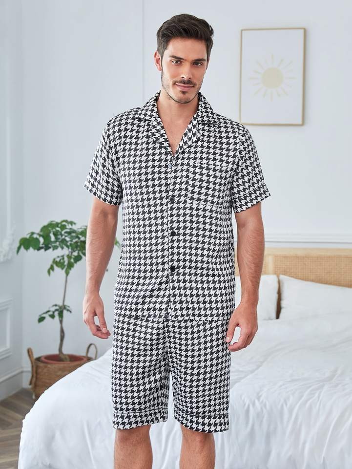 Summer Short 2 Piece Men's Sleepwear Houndstooth Plaid Print Loungewear Shorts Custom Cotton Mens Pajamass